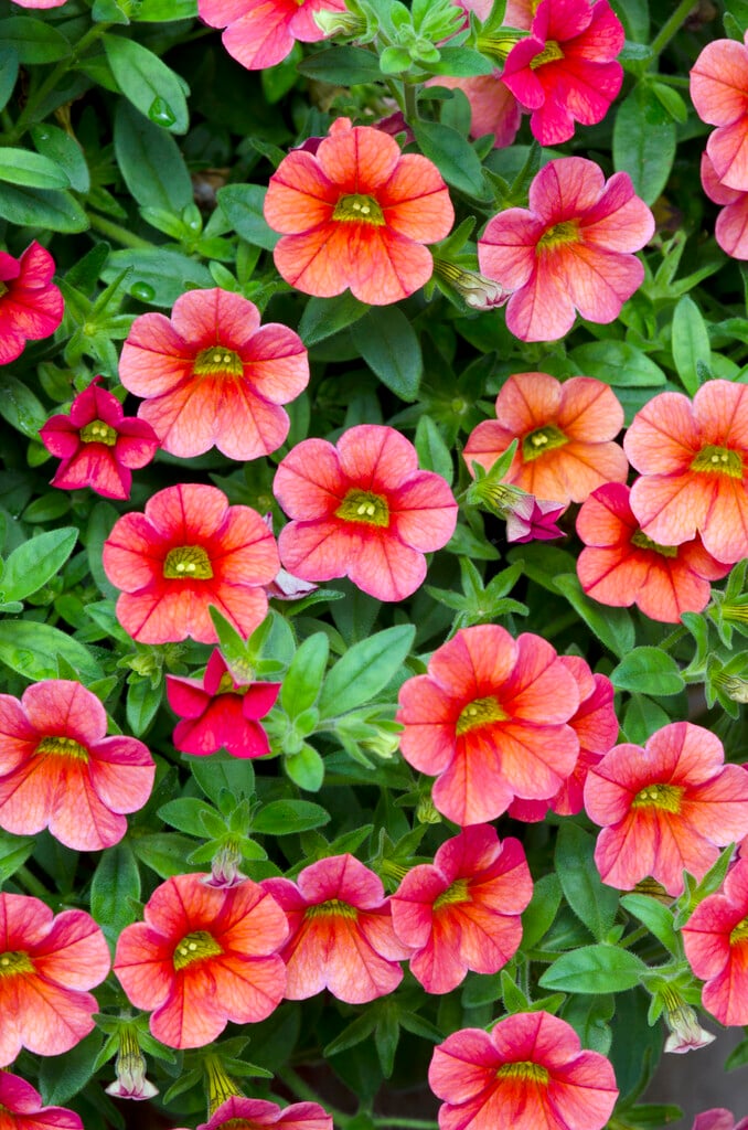 Calibrachoa are tender woody-based perennials usually grown as annuals, mostly trailing in habit, with simple leaves and petunia-like, trumpet-shaped flowers over a long period