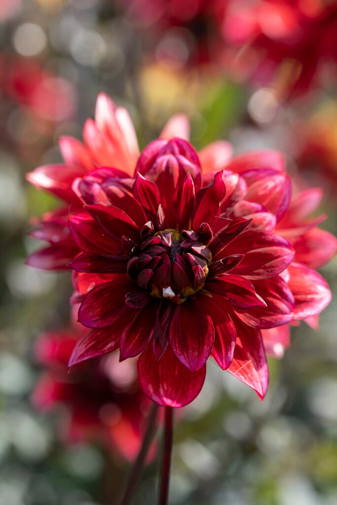 A tuberous-rooted perennial to about 90cm, with dark stems and unusual, purple-flushed, grey-green foliage. From mid-summer to the first frost produces double flowers with pointed, dark red petals fading to pale pink at the tips