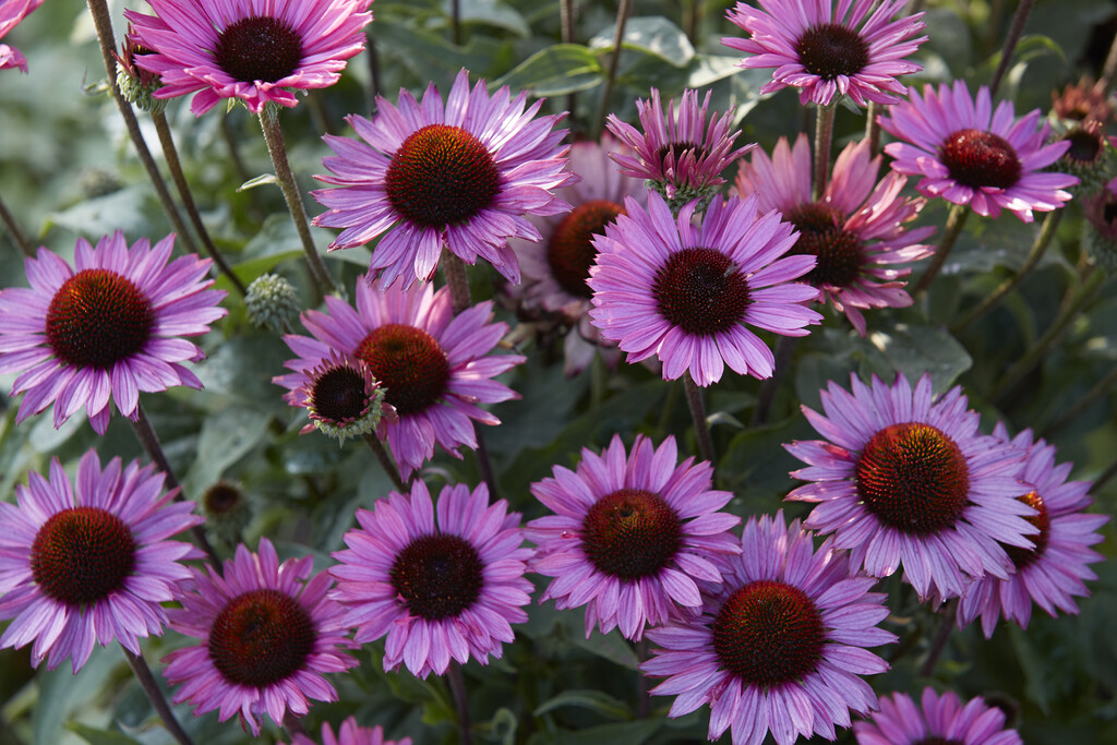 Echinacea are erect, clump-forming rhizomatous perennials with simple or pinnately lobed leaves and solitary, long-stalked daisies with prominent conical central disks and often drooping ray florets; attractive to butterflies