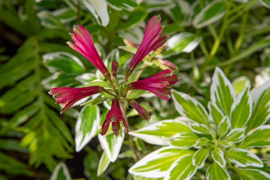 Alstroemeria are fleshy rooted herbaceous perennials forming spreading clumps of erect stems bearing narrowly lance-shaped leaves, with umbels of showy funnel-shaped flowers in summer