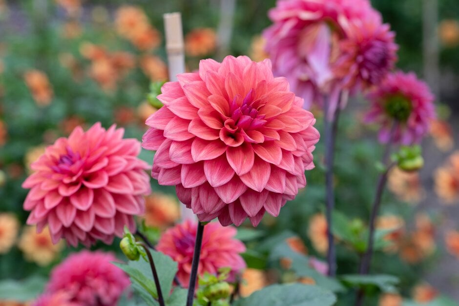 Dahlia are tuberous rooted perennials with pinnately divided leaves and showy flowerheads, double in many cultivars, in summer and autumn