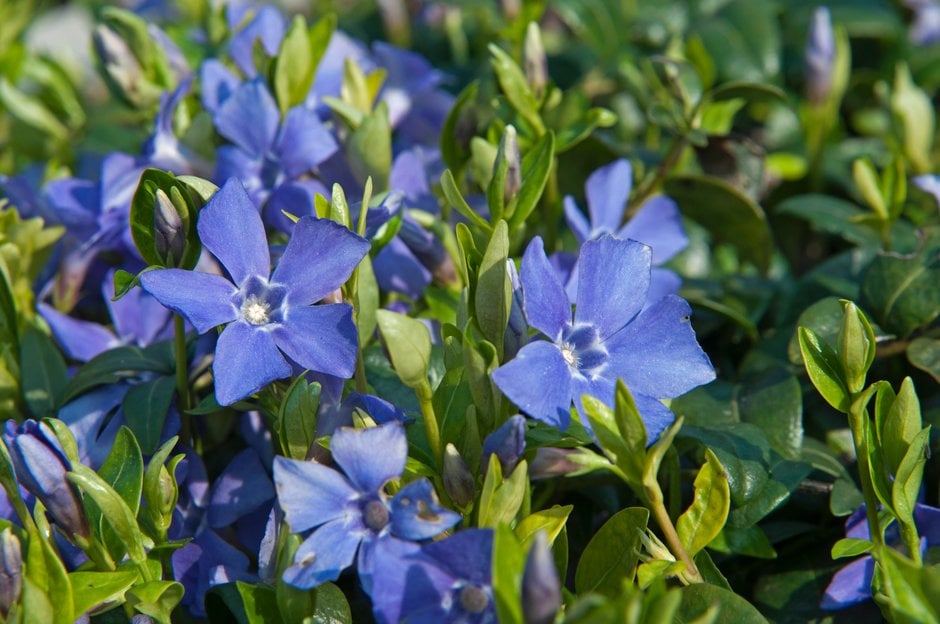 Vinca can be evergreen subshrubs or herbaceous perennials, with simple, paired leaves and solitary, 5-lobed, salver-shaped flowers in the leaf axils