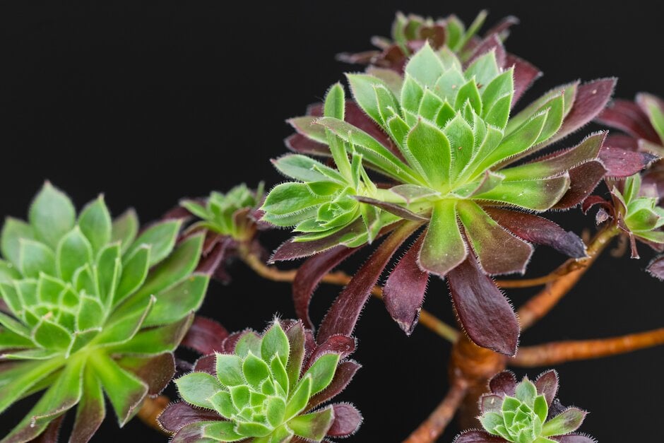Grow in pots of peat-free, loam-based compost with added extra grit. Position in a sunny spot for the best leaf colouration; aeonium will tolerate some shade but the leaves become green. Water moderately when in growth, not at all when dormant. Apply a balanced liquid fertiliser 2 or 3 times during the growing season. In winter move plants to a frost-free greenhouse or conservatory. See hardy cacti and succulent cultivation for further information