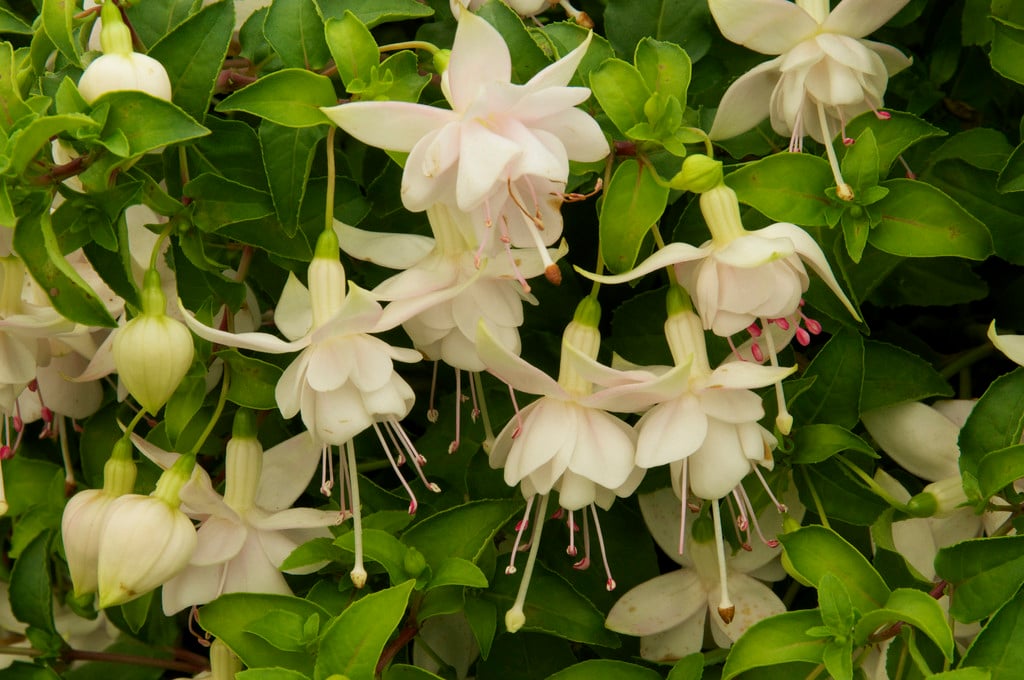 A compact, trailing to bushy shrub reaching up to 50cm tall and wide with lime-green foliage. Double white tubular flowers with pink-tipped stamens are borne in summer and early autumn