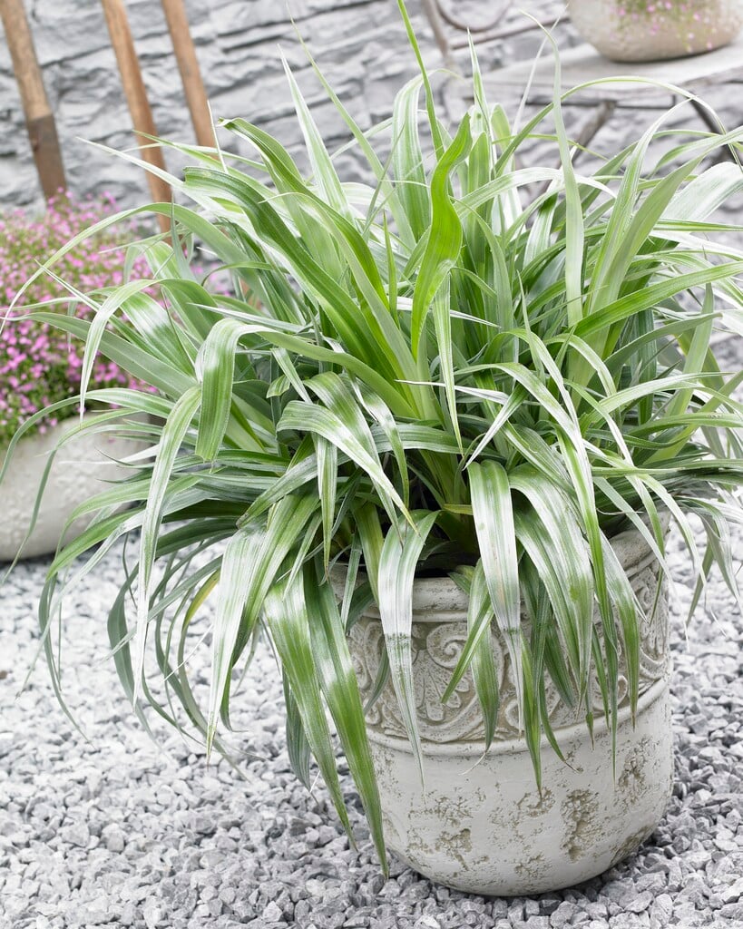 A large, vigorous, clump-forming, evergreen perennial with pointed, silvery, spear-shaped leaves and, occasionally in mid- to late-spring, long stalks of pale yellowish-green flowers, followed by orange berries in the summer on female plants.
