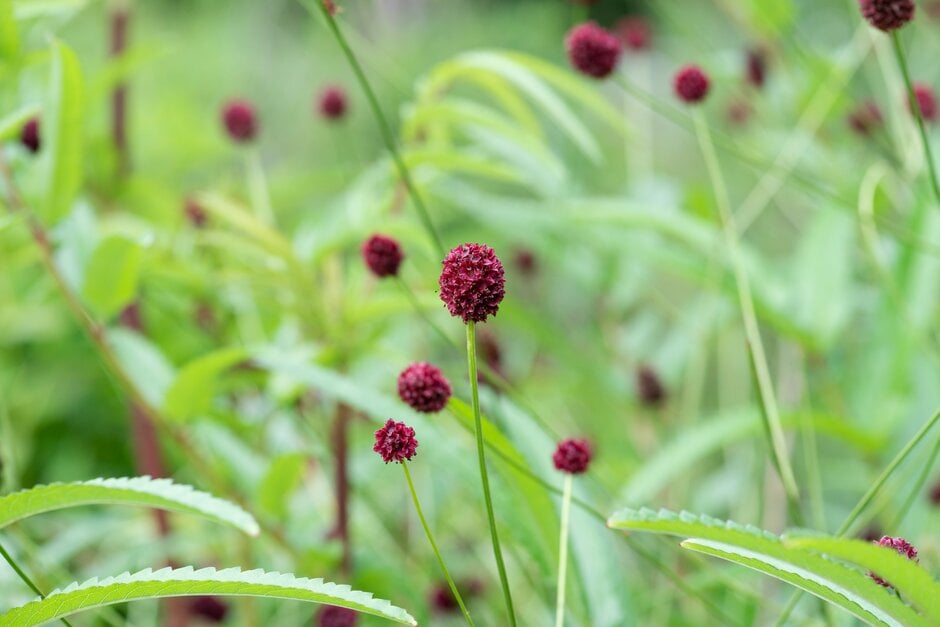 Sanguisorba are rhizomatous herbaceous perennials with attractive, pinnate leaves and branched stems bearing terminal spikes of small fluffy flowers with conspicuous stamens