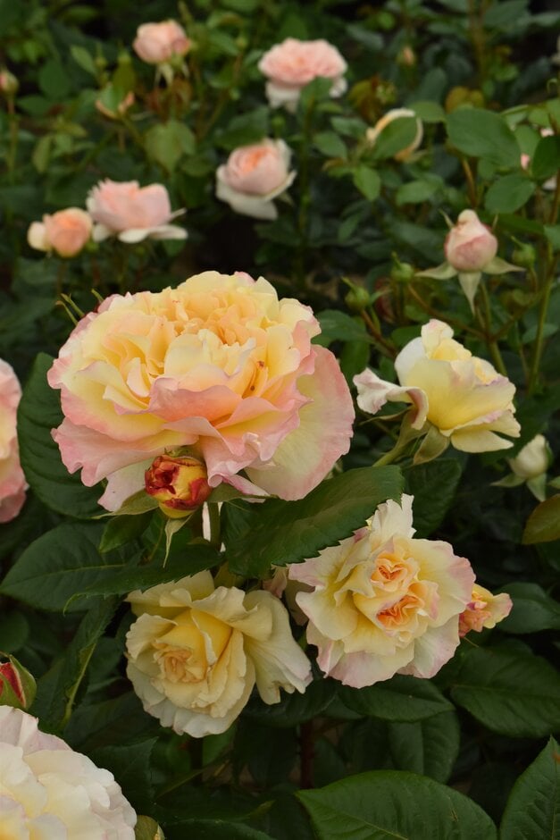 Bushy rose about 1m tall, with healthy glossy, mid-green leaves on strong, upright stems. Solitary or sometimes clusters of very fragrant, large, soft buttery-yellow, high-centred blooms flushed with pinkish-orange at the petal edges, repeat-flowering through summer to autumn