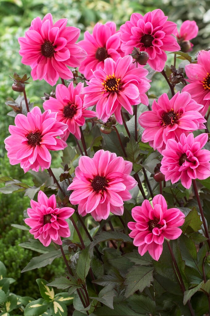 A tuberous-rooted perennial to about 45-50cm in height, with dark green foliage. Single flowers have broad, rounded, bright pink petals and a yellow-banded, dark reddish central disc, blooming from midsummer until the first frosts