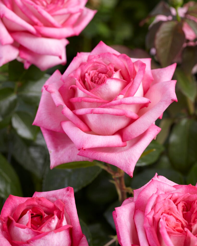 Bushy, upright rose to about 80cm tall, with semi-glossy, dark green foliage, and large, fragrant, very full-petalled, high-centred pink blooms, repeat-flowering through summer and autumn