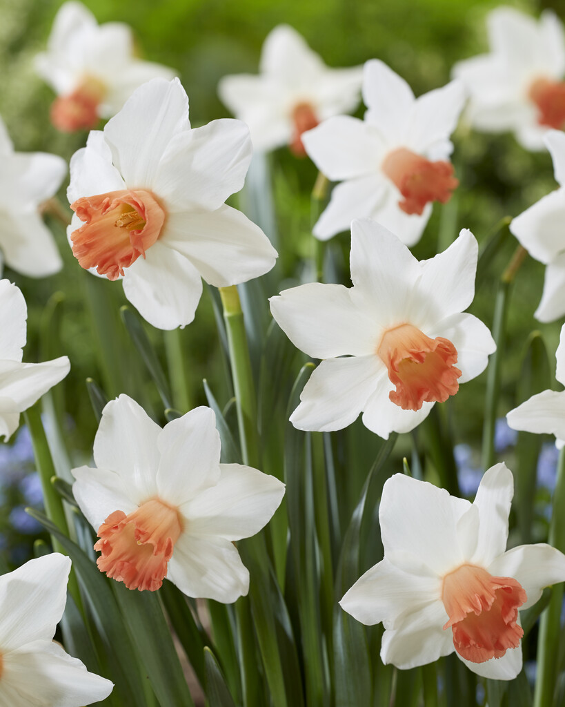 A clump-forming daffodil, to around 45cm high, with grey-green, strap-shaped leaves. Flowers are fragrant and up to 10cm across, with white, slightly swept-back petals and a pink corona with a flared and ruffled rim