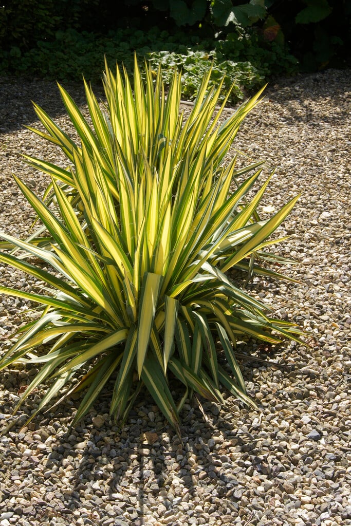A clump-forming, evergreen perennial to around 150cm in height, with rosettes of stemless, sword-shaped, variegated rich green leaves with a broad stripe of bright golden yellow in the centre of each. Creamy-white, bell-shaped flowers may be produced in late summer. Drought tolerant once established