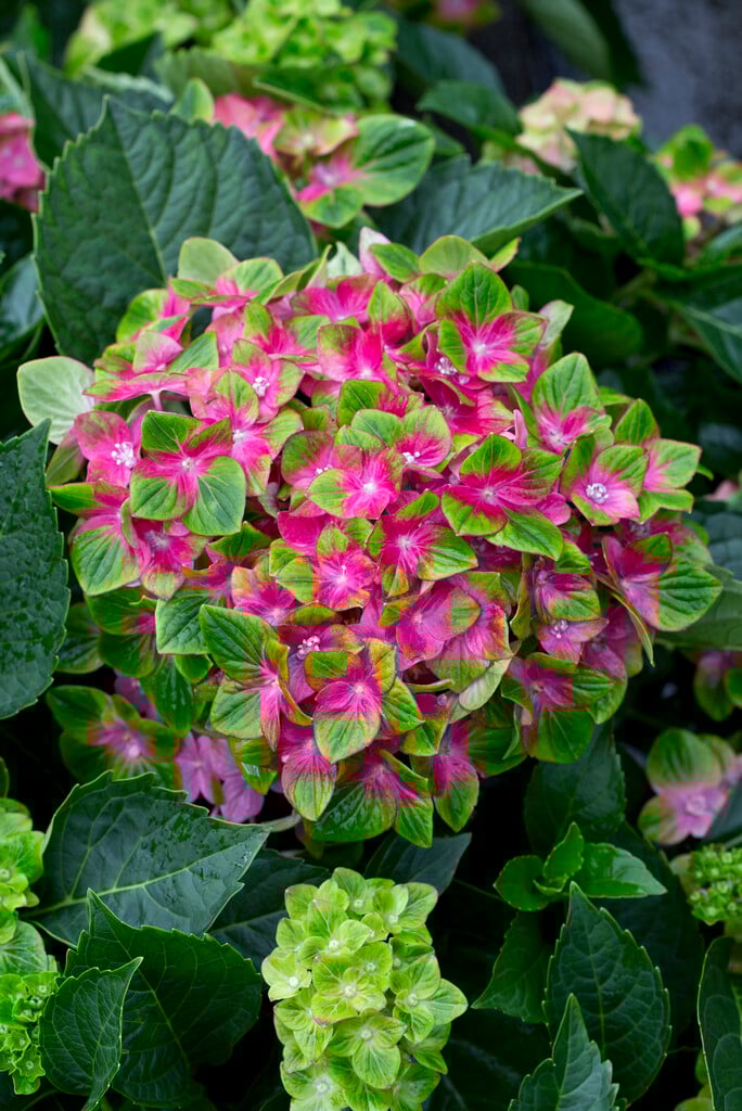 A deciduous shrub with broadly ovate, toothed leaves, and domed clusters of flowers in summer. Flowers are brightly coloured, bluish purple in the centre and bright pink with lime green splashes on the petals. Colours will vary depending on the pH of the soil, being more blue in more acidic soils.
