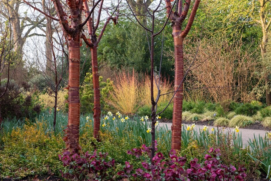 Prunus can be deciduous or evergreen trees or shrubs with showy flowers in spring, and often good autumn foliage colour. Some have edible fruit in autumn, and a few species have ornamental bark