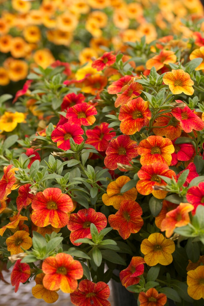 Calibrachoa are tender woody-based perennials usually grown as annuals, mostly trailing in habit, with simple leaves and petunia-like, trumpet-shaped flowers over a long period