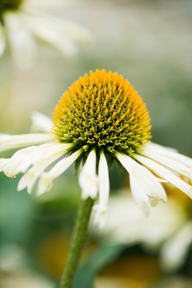 Echinacea are erect, clump-forming rhizomatous perennials with simple or pinnately lobed leaves and solitary, long-stalked daisies with prominent conical central disks and often drooping ray florets; attractive to butterflies