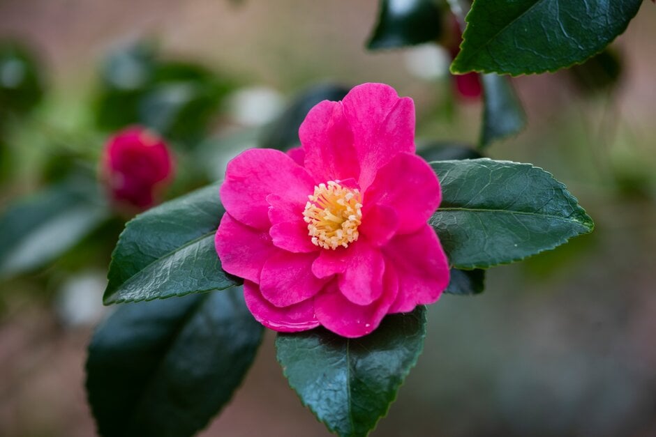 Camellia are evergreen shrubs with simple, ovate, glossy, leathery leaves and showy flowers with solitary or clustered flowers early in the year