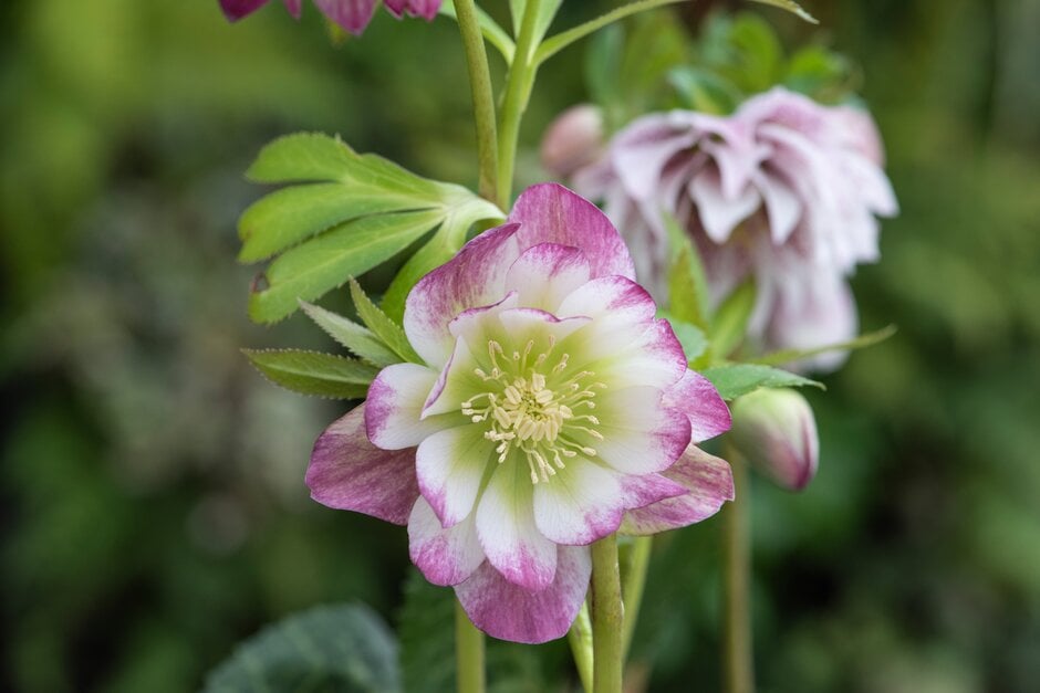 A bushy, clump-forming, semi-evergreen to evergreen perennial with rich green foliage and double, saucer-shaped white flowers with raspberry-red flushed edges and a green eye, which appear from February to April