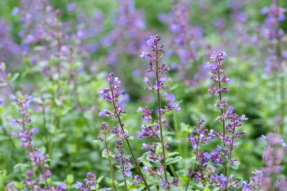 A clump-forming, compact, bushy deciduous herbaceous perennial with aromatic silvery grey-green foliage and upright spikes of purple-blue flowers from summer through to autumn. Cats are attracted to this plant