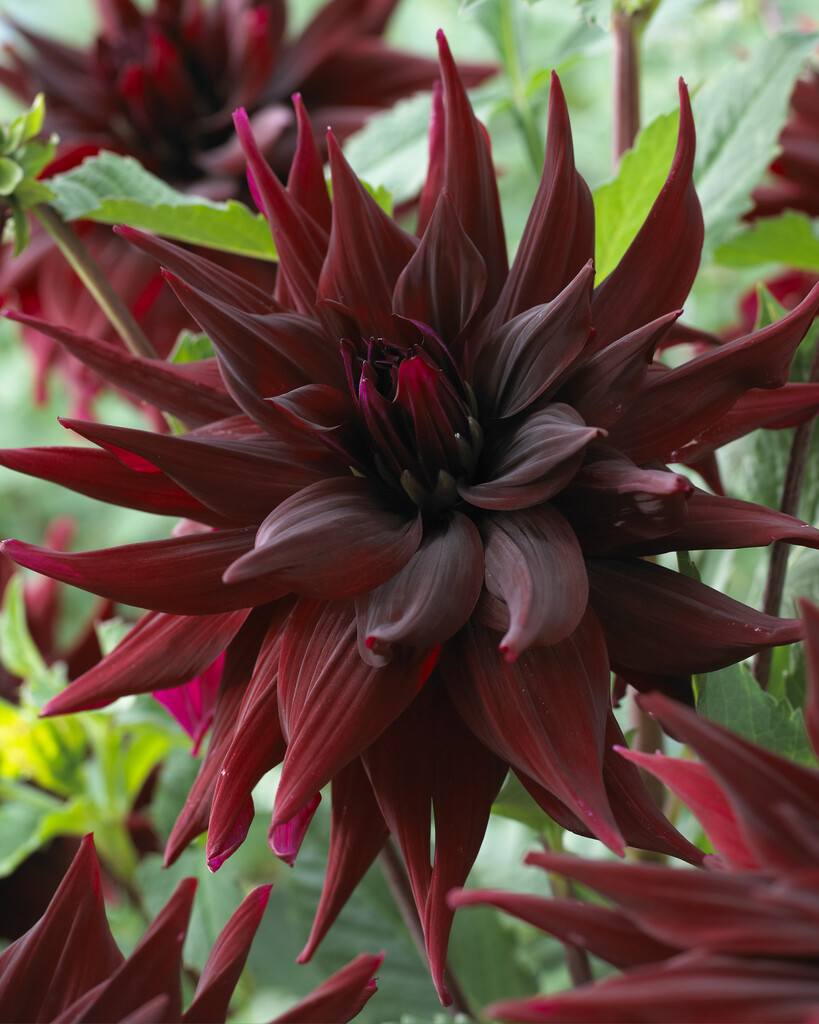 Dahlia are tuberous rooted perennials with pinnately divided leaves and showy flowerheads, double in many cultivars, in summer and autumn