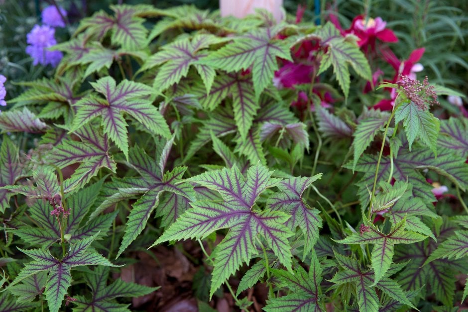 A clump-forming perennial to 80cm tall when in flower, producing bright green, toothed, palmate leaves with bold, maroon veins. From mid to late summer it bears plumes of fluffy, pale pink flowers, held on wiry stems above the foliage
