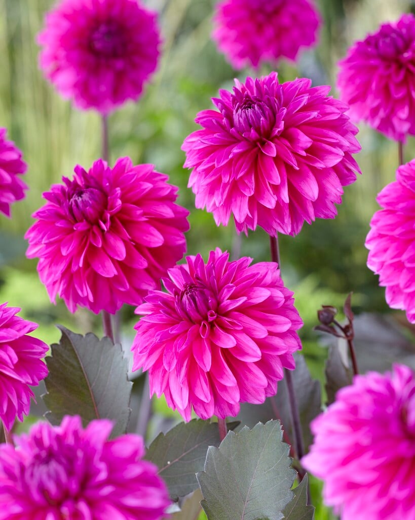 Tuberous-rooted perennial about 1m tall, with dark stems and bronze-purple leaves. Almost black buds open to fully double, dark magenta flowers to 10cm wide with slightly incurved petals occasionally edged white, produced from midsummer until the first frost
