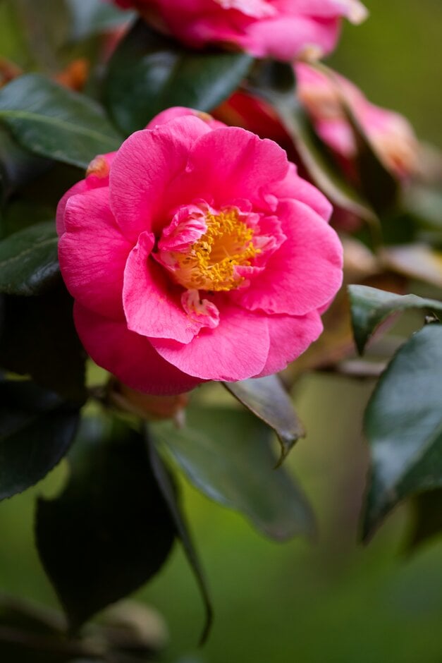 Camellia are evergreen shrubs with simple, ovate, glossy, leathery leaves and showy flowers with solitary or clustered flowers early in the year