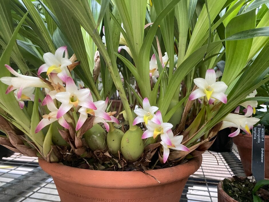 Grow in an open, free-draining, bark-based orchid mix. Provide enough bright filtered light, but keep away from direct sunlight or a heating source. Ideal temperatures are around 13 °C minimum at night and up to maximum 24 °C during the day. Water with soft water (ideally rainwater) when the pot feels light when lifted. Ensure that all water drains away, preventing the plant from sitting wet. Orchid fertiliser can be applied regularly throughout the growing season. Reduce watering and feeding in winter months. The orchid will naturally produce rhizomes with aerial roots growing outside the pot. As with many orchids, they grow best when well-established and slightly pot-bound. Re-potting should be only done if the plant overgrows its container or before the potting mix starts to deteriorate - approximately once in 2-3 years. See indoor orchid cultivation for more tips.