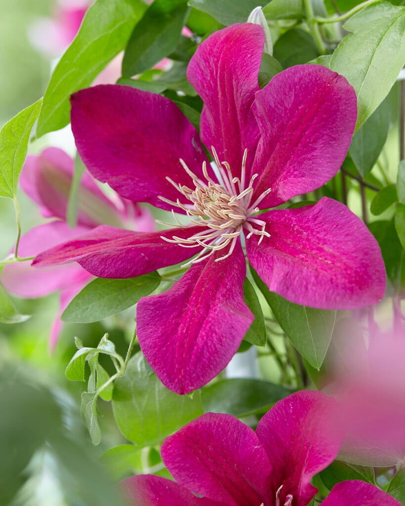 A medium-sized, compact deciduous perennial climber with dark green leaves. Large, rich dark pink to pale red flowers with creamy anthers appear from late spring through until early autumn
