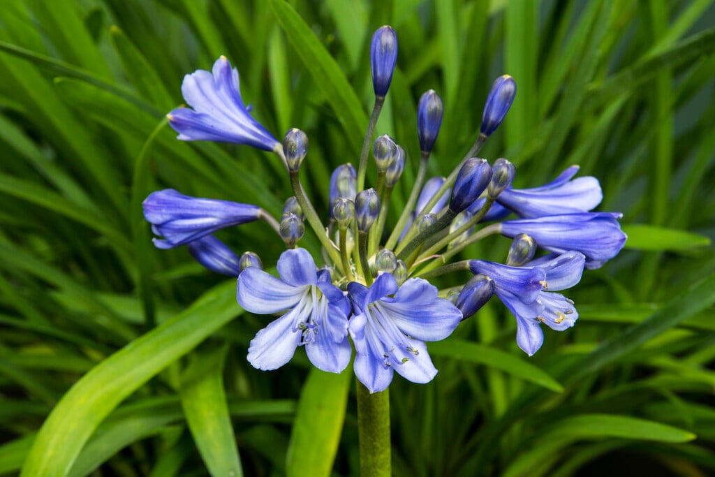 Agapanthus are clump-forming perennials with narrowly strap-shaped leaves, evergreen in some species, and erect stems bearing umbels of funnel-shaped blue or white flowers