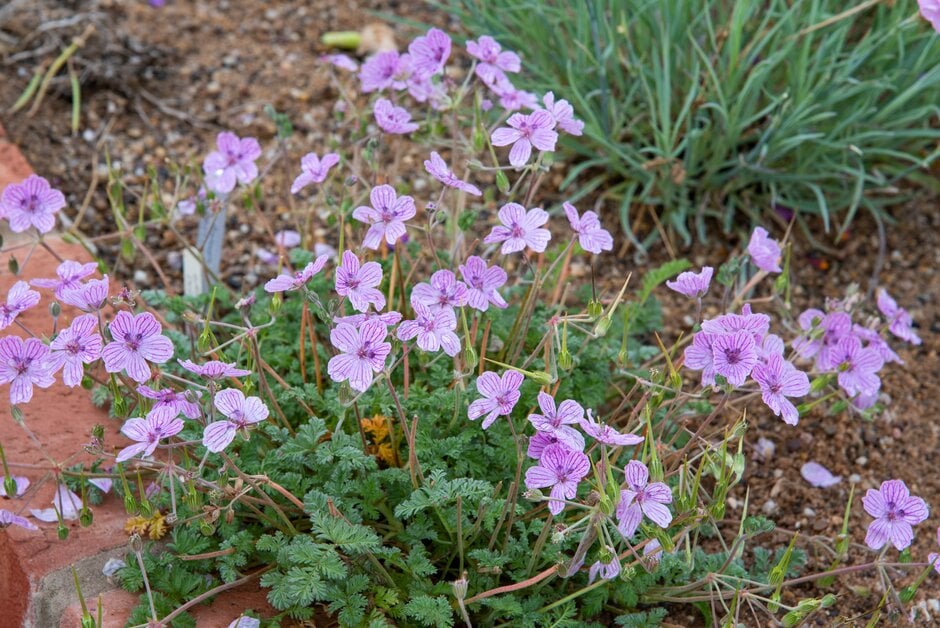 Erodium can be annuals, perennials or subshrubs, some evergreen, with lobed or pinnately divided leaves and bowl-shaped, 5-petalled flowers in summer