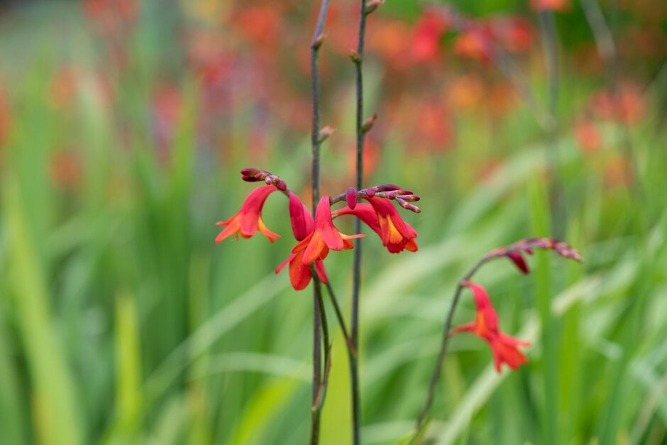 Crocosmia are deciduous cormous perennials with erect, sword-shaped leaves and branched spikes of showy, funnel-shaped flowers in summer
