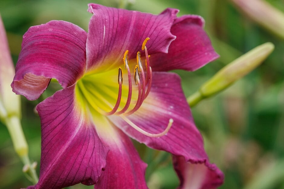Hemerocallis may be evergreen or herbaceous perennials, with narrow, strap-shaped leaves and funnel-shaped flowers on erect stems in late spring or early summer