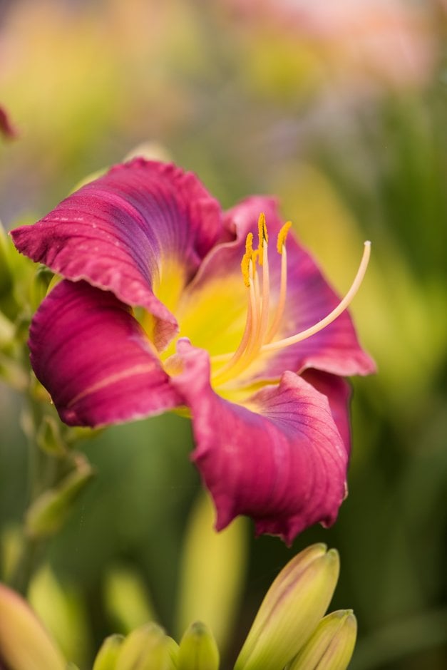Hemerocallis may be evergreen or herbaceous perennials, with narrow, strap-shaped leaves and funnel-shaped flowers on erect stems in late spring or early summer