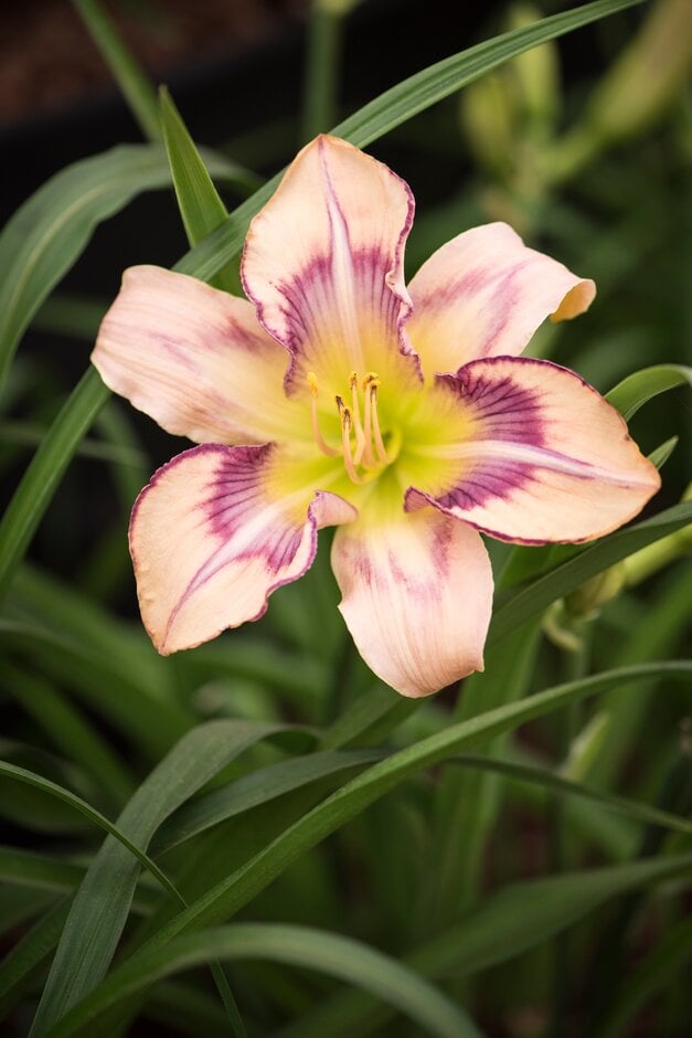 Hemerocallis may be evergreen or herbaceous perennials, with narrow, strap-shaped leaves and funnel-shaped flowers on erect stems in late spring or early summer
