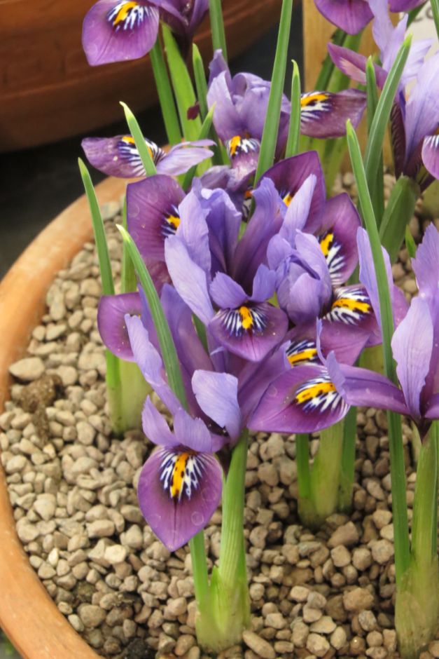Reticulata irises are small, bulbous perennials with narrow leaves almost square in section, and solitary, sometimes fragrant purple, yellow or blue flowers in early spring