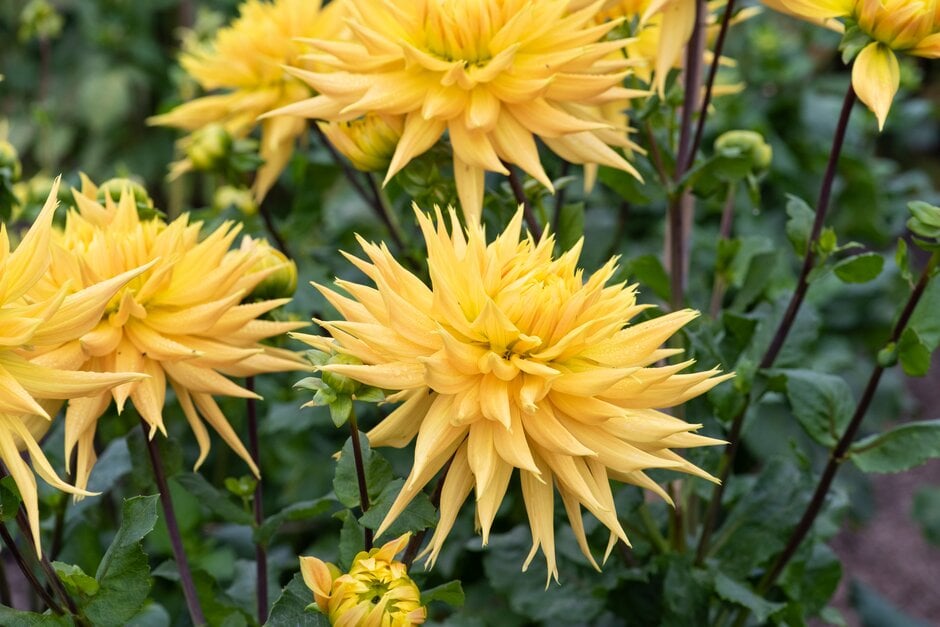 A bushy, clump-forming, tuberous perennial with dark green serrated leaves. Large, golden yellow flowers with finger-like petals appear on sturdy, upright stems in summer, through until the first frosts of autumn