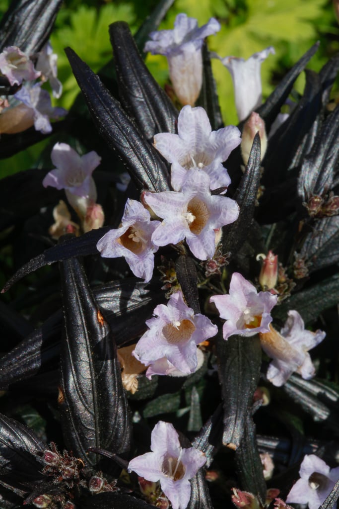 A tender, evergreen, bushy sub-shrub to around 1m tall and wide with dark purple to brown, lance-shaped, toothed leaves, Tubular, pale purple flowers are borne in spring