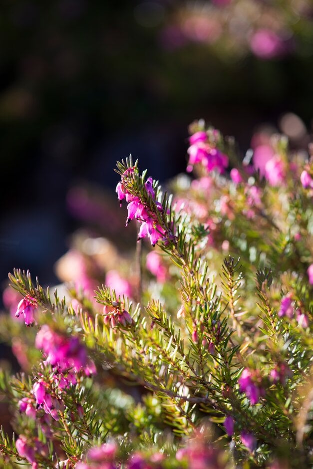 Erica can be prostrate or erect, evergreen shrubs with fine, needle-like leaves in whorls, and racemes or panicles of small, bell-shaped or tubular flowers