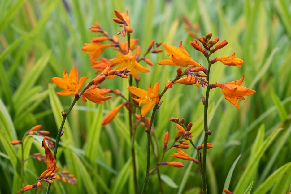 Crocosmia are deciduous cormous perennials with erect, sword-shaped leaves and branched spikes of showy, funnel-shaped flowers in summer