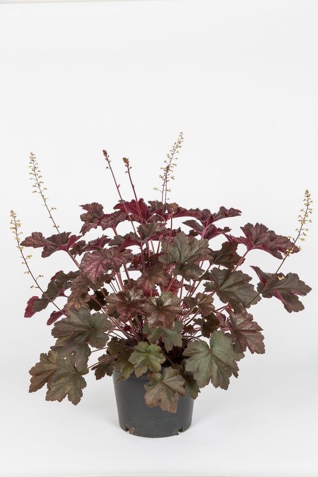 Heuchera are more or less evergreen, clump-forming perennials with attractive, rounded, shallowly palmately lobed leaves and racemes or panicles of small, tubular flowers, often with colourful calyces