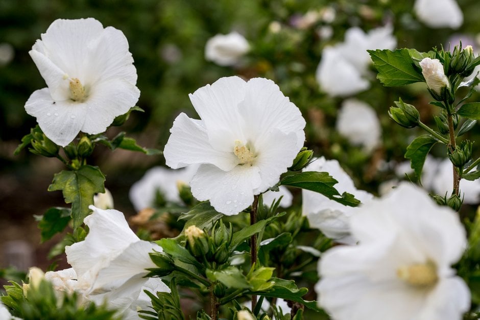 Hibiscus can be deciduous or evergreen shrubs, trees, annuals or perennials, with simple or palmately lobed leaves and large, funnel-shaped flowers over a long flowering season
