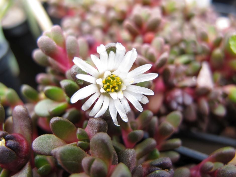 Seanii-hoganii is a spreading, low-growing succulent to 5cm tall. The fleshy leaves are dark green, flushed with red and purple, and in winter they turn deep maroon in colour. White, daisy-like flowers are borne in summer