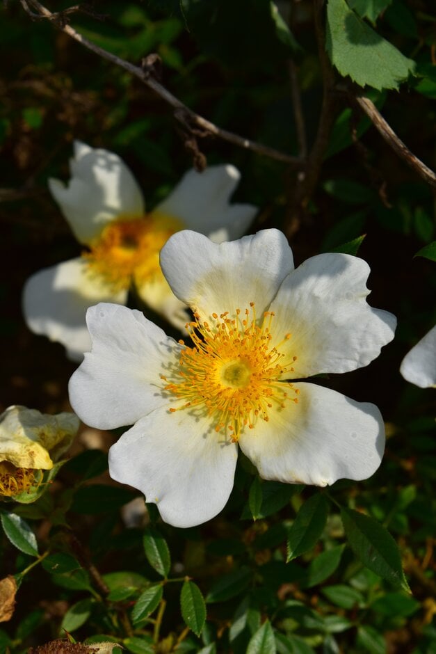 Rosa can be deciduous or semi-evergreen shrubs or scrambling climbers, with usually thorny stems bearing compound pinnate leaves and solitary or clustered flowers. Flowers may be followed by showy red or purple fruits in some varieties.