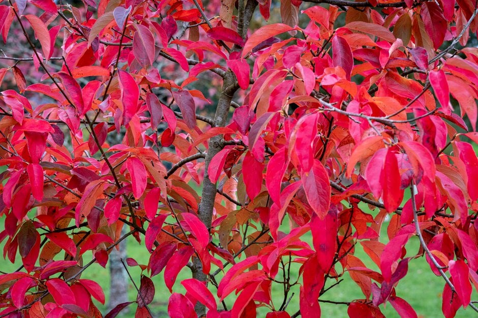 A glamorous deciduous tree to 10m and eventually nearly as wide. It has glossy leaves which emerge tinted red then become deep green, finally turning bright red-orange in autumn. It may develop blue-black fruit if the inconspicuous flowers are pollinated.