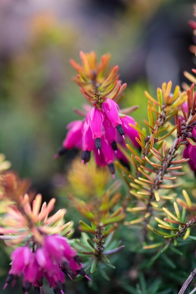 Erica can be prostrate or erect, evergreen shrubs with fine, needle-like leaves in whorls, and racemes or panicles of small, bell-shaped or tubular flowers
