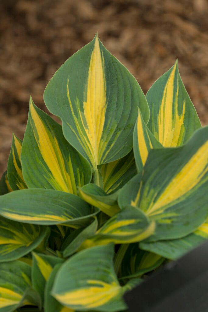 Hosta are clump-forming herbaceous perennials with simple, ovate or lance-shaped leaves, often attractively coloured or variegated, and erect racemes of nodding, funnel or bell-shaped flowers in early summer
