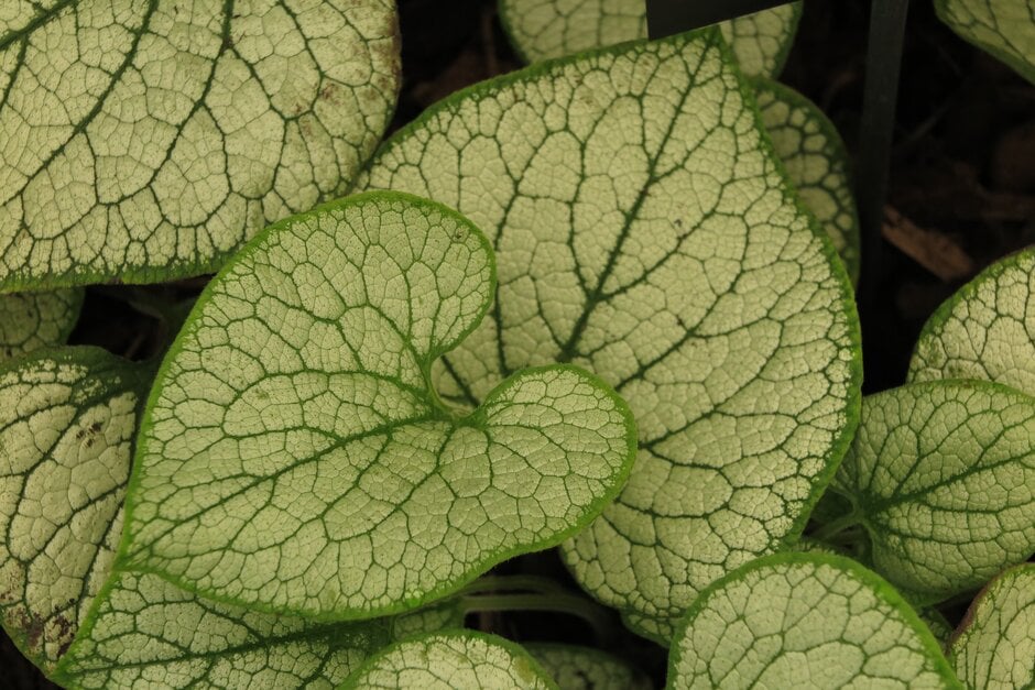 Brunnera are rhizomatous herbaceous perennials with large, ovate or heart-shaped basal leaves and sprays of small bright blue flowers in spring