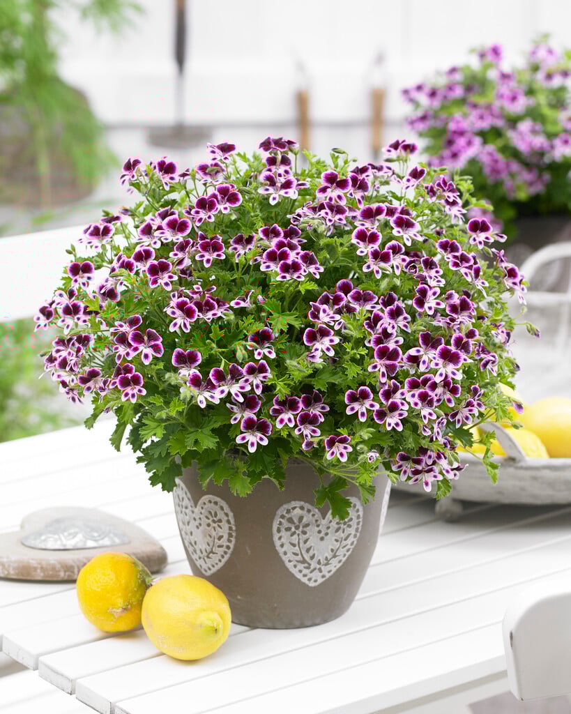 A tender evergreen perennial, with a compact, bushy habit and aromatic, lobed green leaves with serrated edges. Flowers from late spring to early autumn, producing masses of small flowers with rich violet upper petals edged with white, and white lower petals with purple blotches