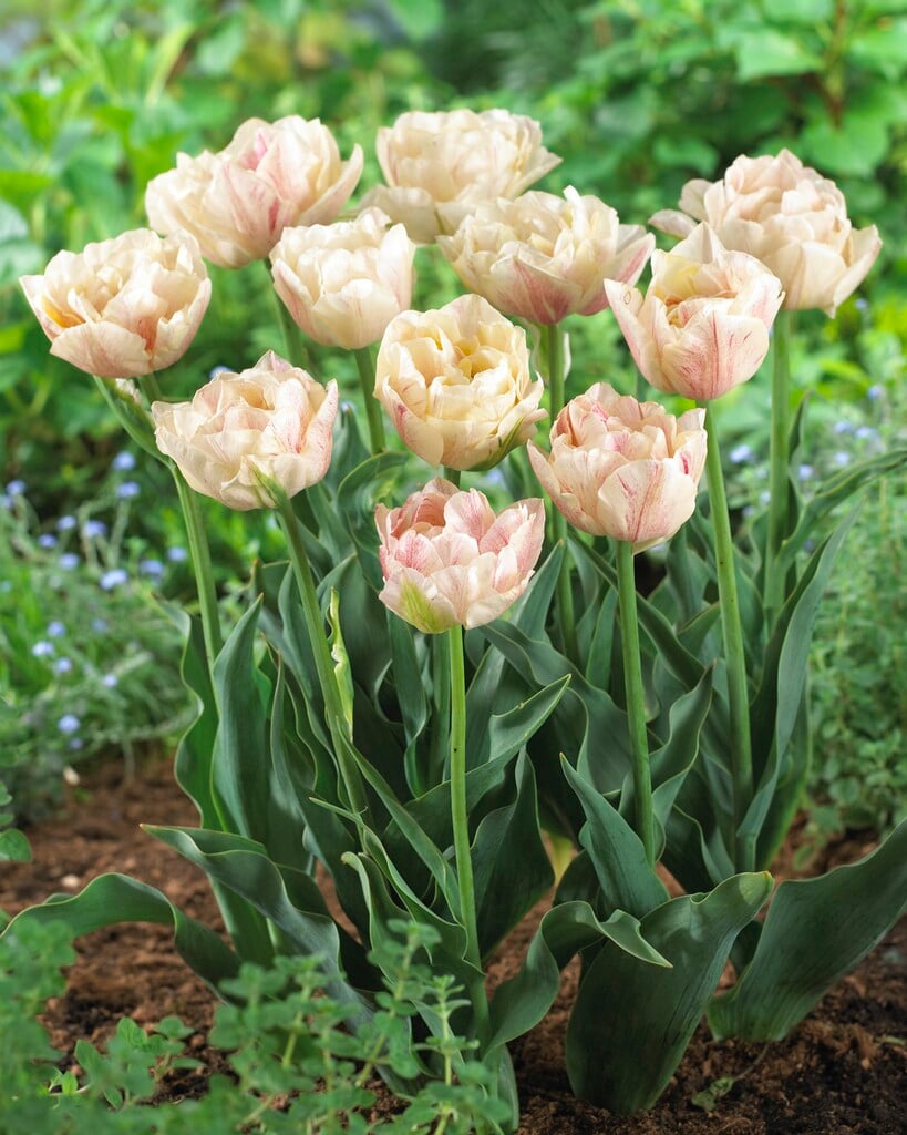 - Double Early Group tulips flower in mid-spring, with double, bowl-shaped flowers, sometimes flecked with a contrasting colour
