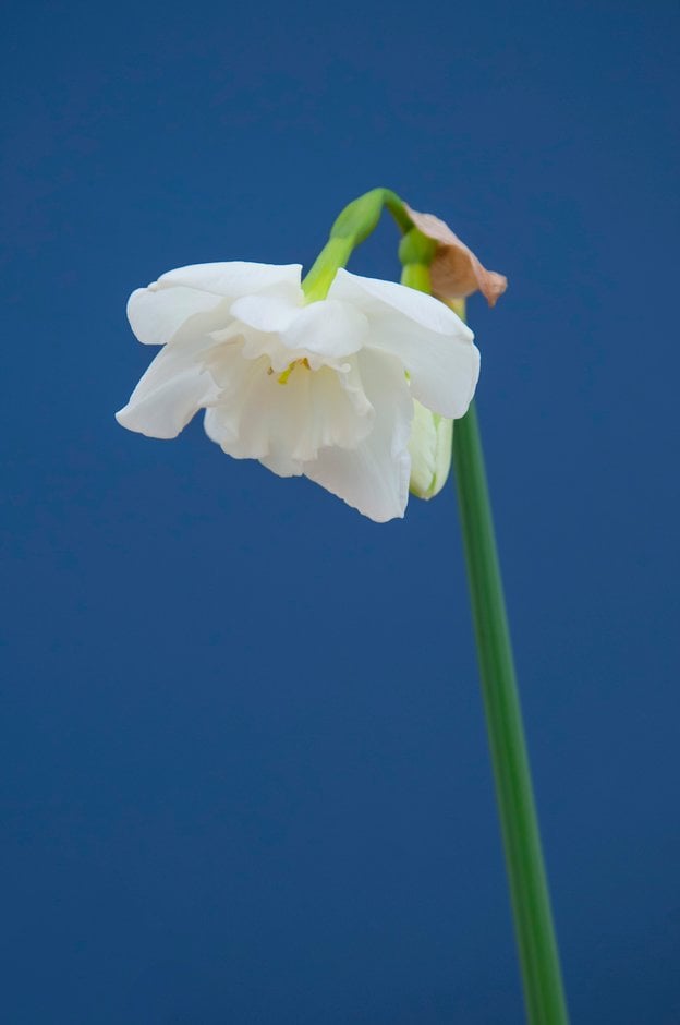 A triandrus daffodil to around 50cm tall flowering in mid-spring. The scented white flowers, usually two per stem, are up to 75mm wide with broadly ovate, overlapping perianth segments and a cup-shaped, ribbed and wavy corona